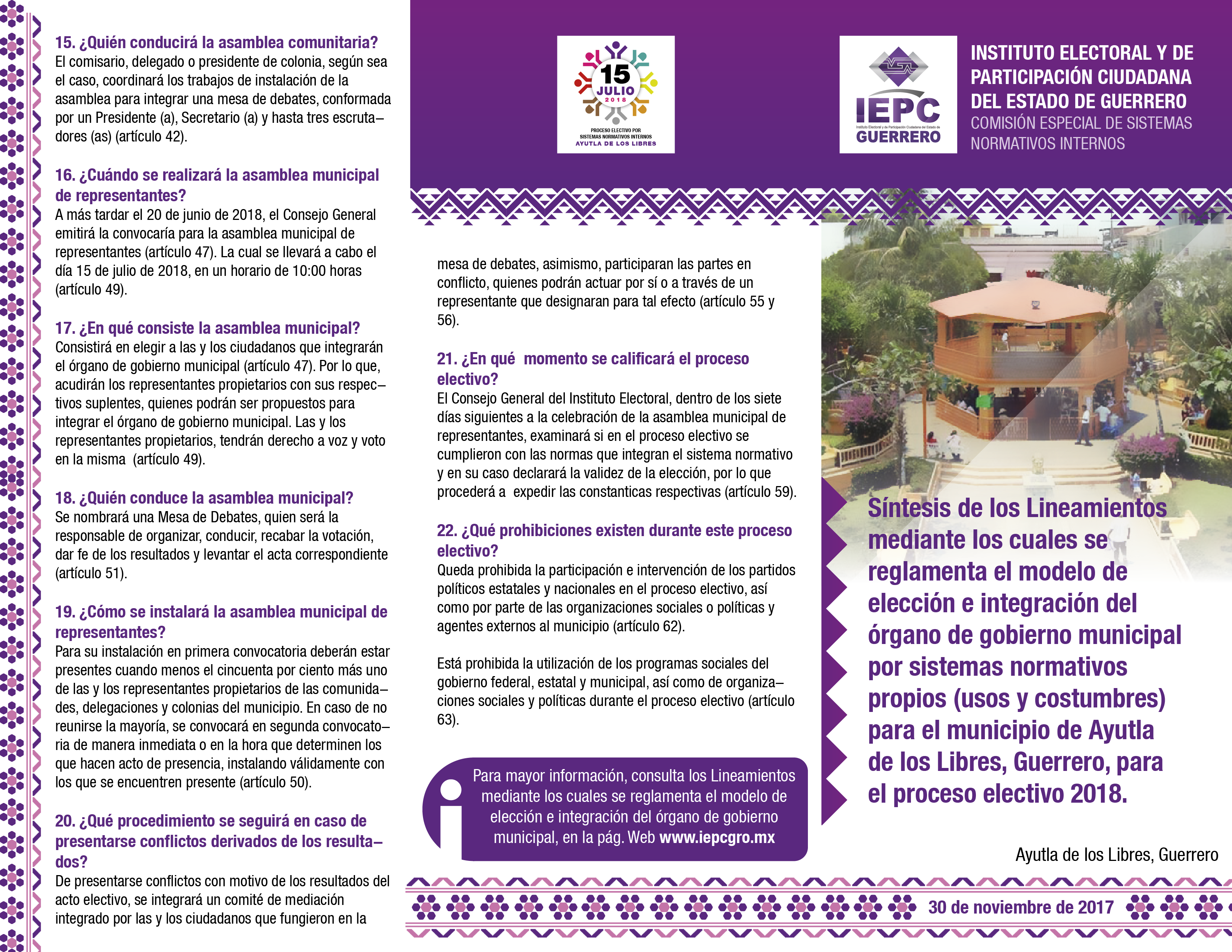 Acuerdo 098/SO/29-11-2017, por el cual se aprueban los Lineamientos mediante los cuales se reglamenta el modelo de elección e integración del órgano de gobierno municipal por sistemas normativos propios (usos y costumbres) para el municipio de Ayutla de los Libres, Guerrero, para el proceso electivo 2018.