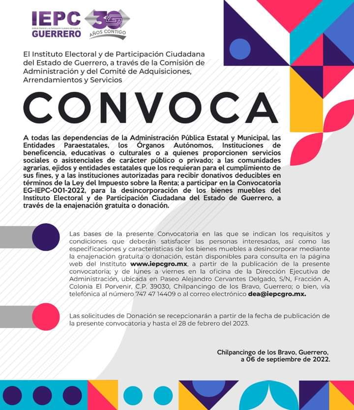 A todas las dependencias de la Administración Pública Estatal y Municipal, las Entidades Paraestatales, los Órganos Autónomos, Instituciones de beneficencia, educativas o culturales o a quienes proporcionen servicios sociales o asistenciales de carácter público o privado; a las comunidades agrarias, ejidos y entidades estatales que los requieran para el cumplimiento de sus fines, y a las instituciones autorizadas para recibir donativos deducibles en términos de la Ley del Impuesto sobre la Renta; a participar en la Convocatoria EG-IEPC-001-2022, para la desincorporación de los bienes muebles del Instituto Electoral y de Participación Ciudadana del Estado de Guerrero, a través de la enajenación gratuita o donación.