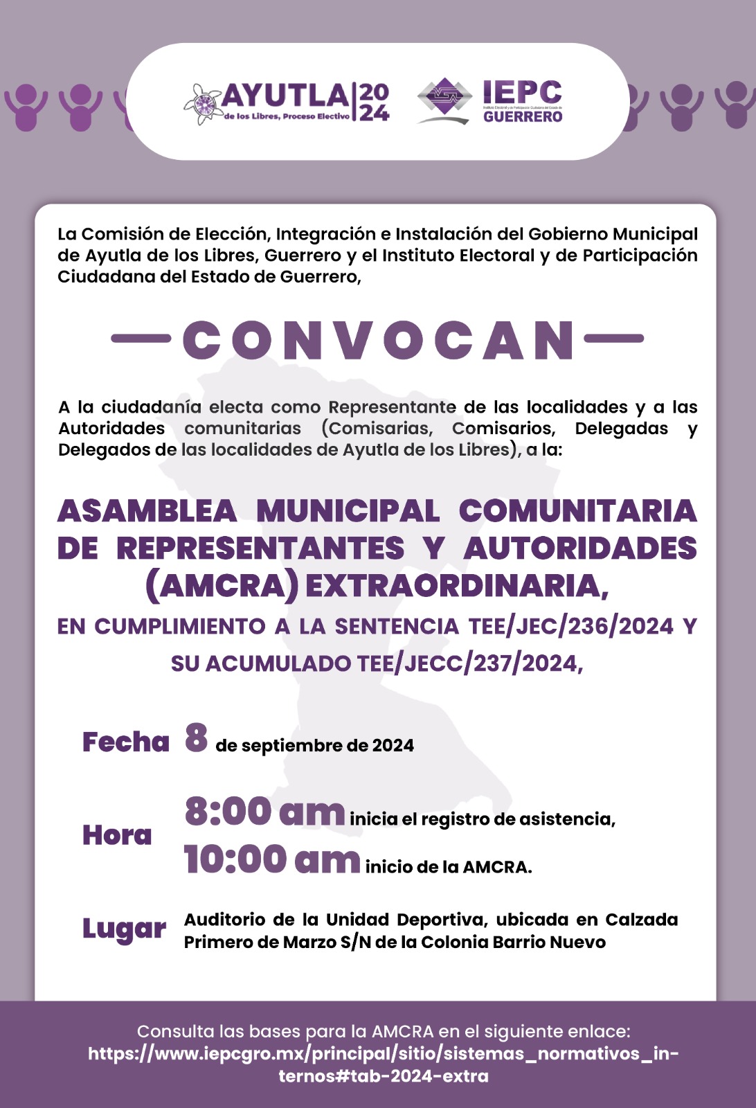 A las y los representantes propietarios o suplentes que fueron electos en cada una de las comunidades, delegaciones y colonias de Ayutla de los Libres, Guerrero, para que asistan y participen en la Asamblea Municipal de Representantes y Autoridades que se llevará a cabo el 30 de mayo de 2021, en la cual se integrará el órgano de gobierno municipal.