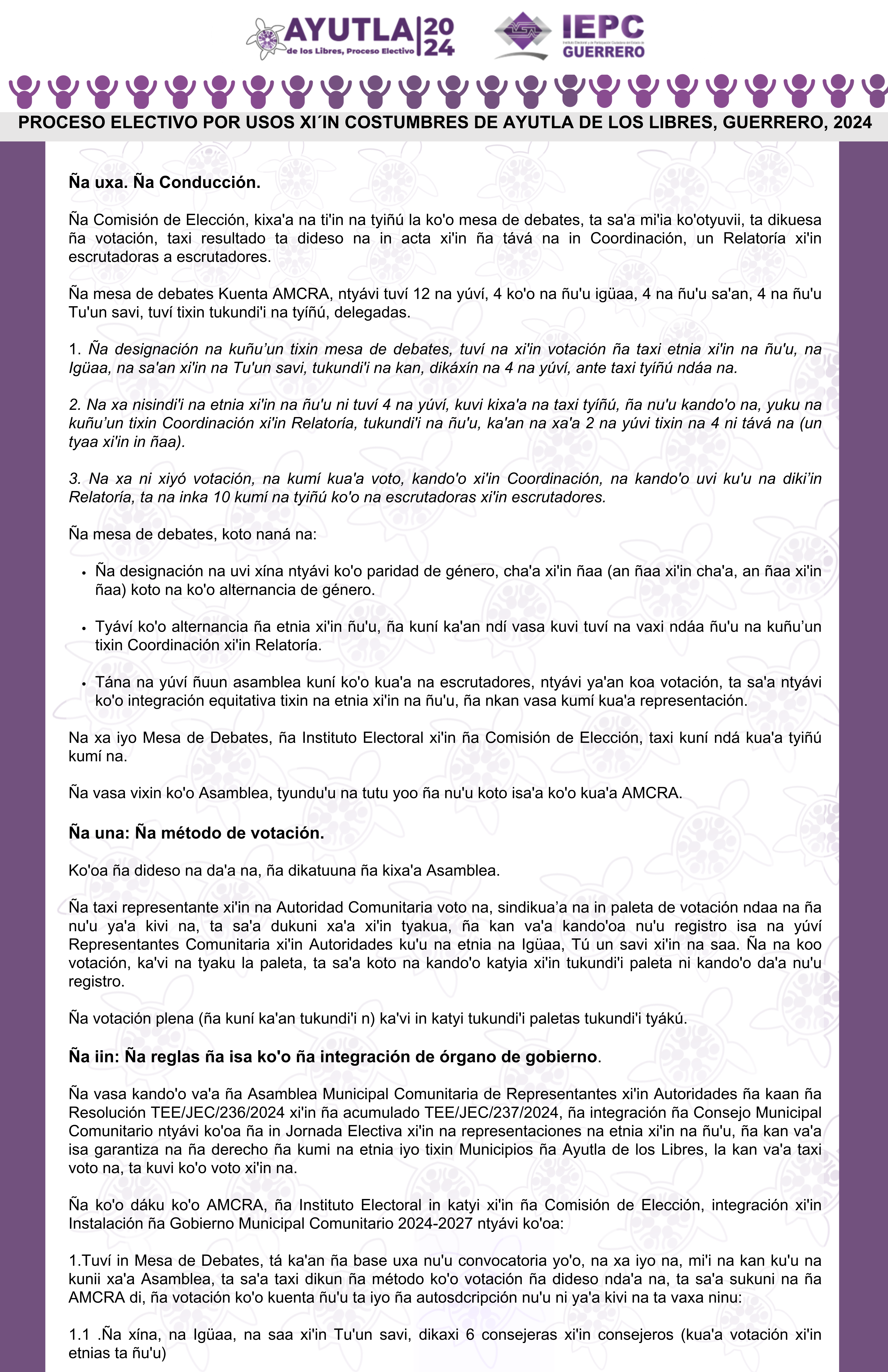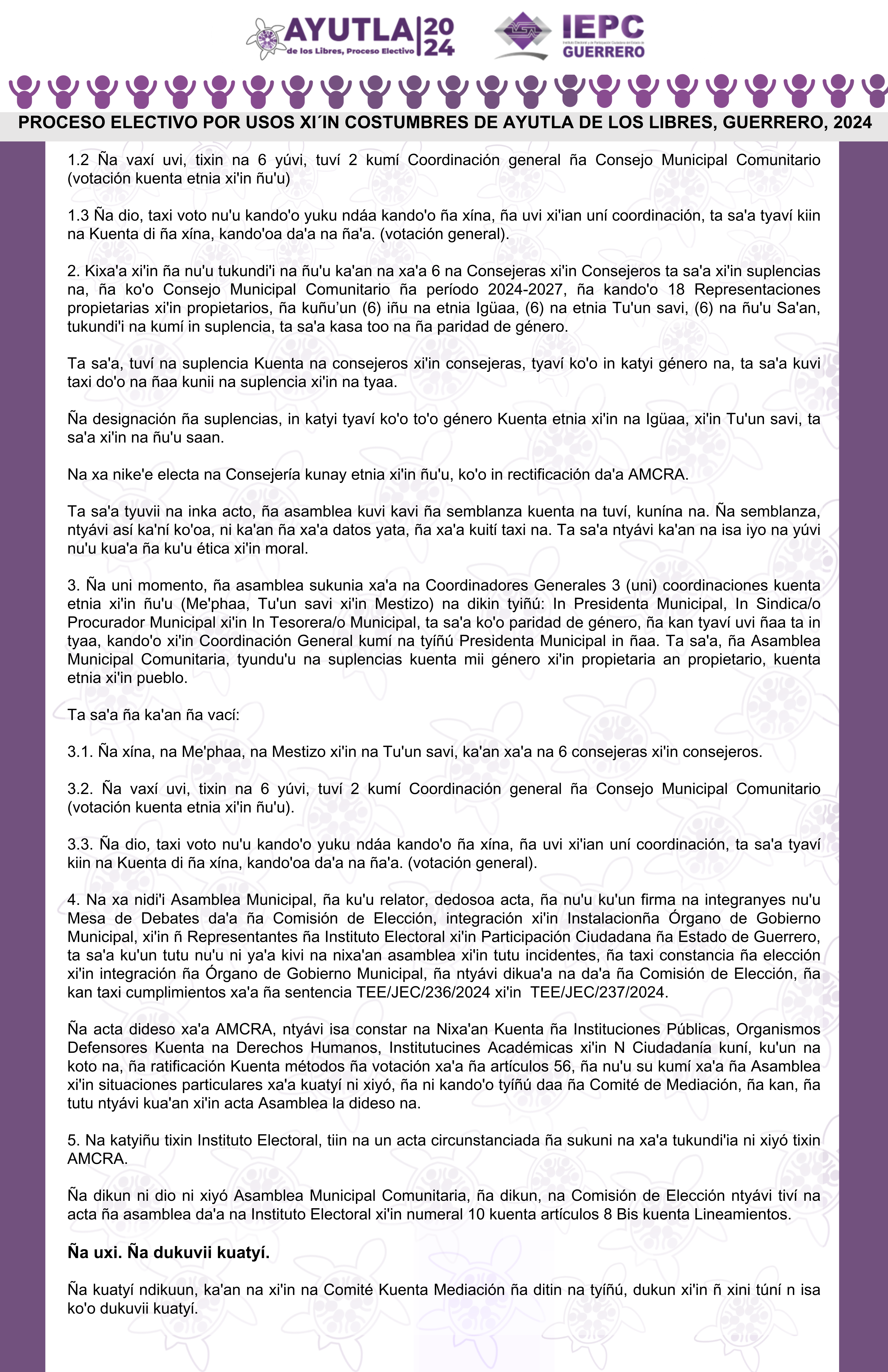 | Relación de ciudadanas y ciudadanos que se eligieron en cada una de las comunidades del municipio Ñuu Savi, Gro. como propuestas para la elección del ayuntamiento municipal 2024-2027. | Descargar | |